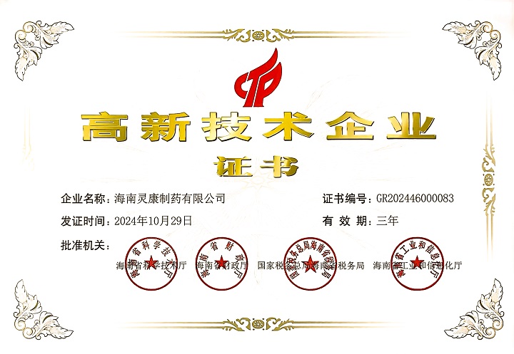 2024年国家高新技术企业认定由海南省科学技术厅、海南省财政厅、国家税务总局海南税务局、海南省工业和信息化厅综合评定、联合审评。评审认定工作重点围绕3年来公司的科技立项、成果转化、高新技术产品收入、知识产权情况、营业收入、研究开发费用以及研究开发人员等相关情况进行梳理评审,每次认定有效期为三年。截止目前,海南灵康制药有限公司已连续5次通过该认定。